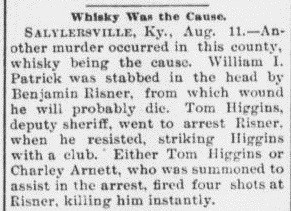 During a drunken brawl, a man, Billy Patrick, was stabbed in the head. At the time the article is written, Patrick is expected to die. The perpetrator, my great-great-grandfather Ben Risner, attacked the deputy sheriffs who came to arrest him. During the ensuing gunfight, my great-great-grandfather was shot dead.